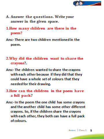 Ans: In the poem, one child has some crayons and the other child has some different crayons. So, if the children share the crayons with each other, they both can have a full pack of colours.